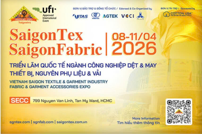 Following the resounding success of the 2025 exhibition, SaigonTex & SaigonFabric 2026 will officially take place from April 8-11, 2026 at the Saigon Exhibition and Convention Center (SECC), District 7.